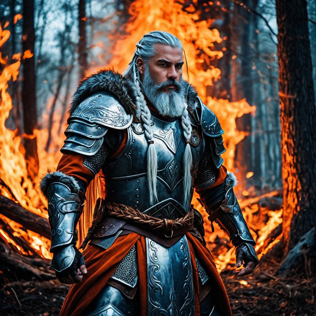 A fierce warrior with long white braided hair and a thick beard wearing intricate heavy armor with fur accents stands ready for battle in a fiery forest. The background is ablaze with intense flames, casting warm orange glows, contrasting with the cool blue steel of his armor. The atmosphere is dramatic and heroic, emphasizing strength and resilience.