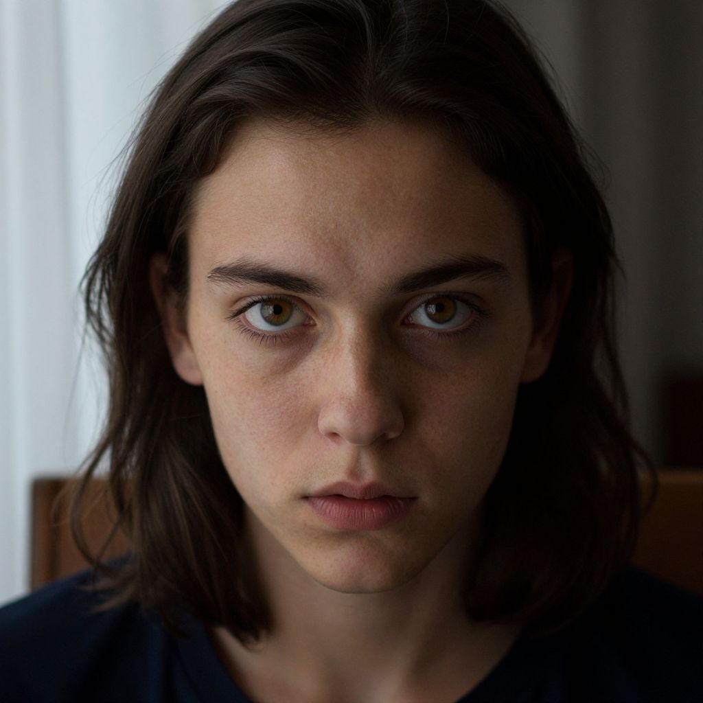 A photograph portrait photograph features a young adult with olive skin, piercing hazel eyes, and an intense expression focused on something beyond the frame. They are seated in a dimly lit room under soft, diffused light filtering through sheer curtains. The focus is sharp on their face, emphasizing detailed textures of freckles across their cheeks and subtle highlights that bring out the depth of their features. Their dark hair falls loosely around their shoulders, creating a contrast against their lighter complexion.