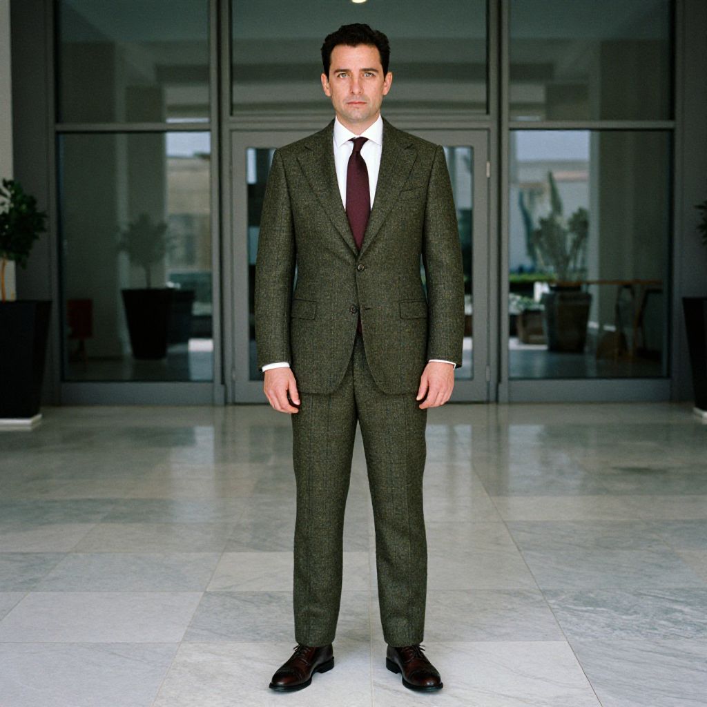 A man, olive green tweed suit, white dress shirt, burgundy tie, dark brown brogues, subtle plaid pattern, elegant glass facades, polished marble floors, cri film style, confident expression. Man has masculine face and piercing eyes