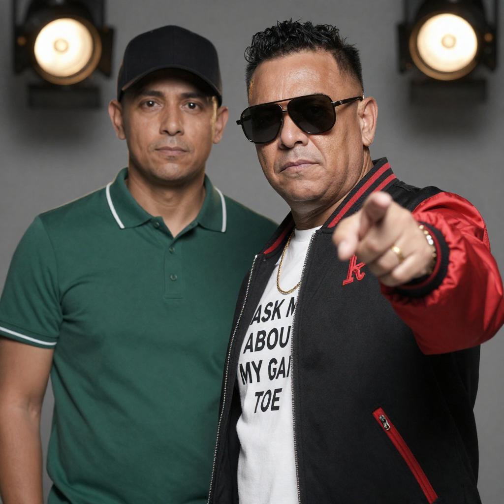 Photograph of two men standing side by side. Foreground man with dark hair, large sunglasses, white shirt, red and black jacket, gold chain, pointing forward. Background man with dark hair, green polo shirt, black cap, neutral expression. Background has round light bulbs. Foreground man's shirt reads "ASK ME ABOUT MY GAME TOE". Foreground man's face shows slight intensity.