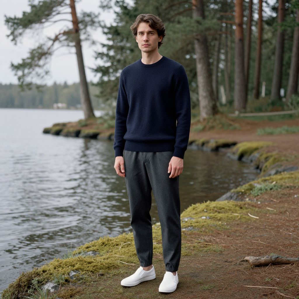 "a man, lightweight merino wool crewneck, deep navy, tailored fit, tapered lounge pants, charcoal gray, minimalist slip-on sneakers, white, serene lakeside, towering pines, soft mossy banks, Ilford film stock, contemplative expression.Man has masculine face and piercing eyes"