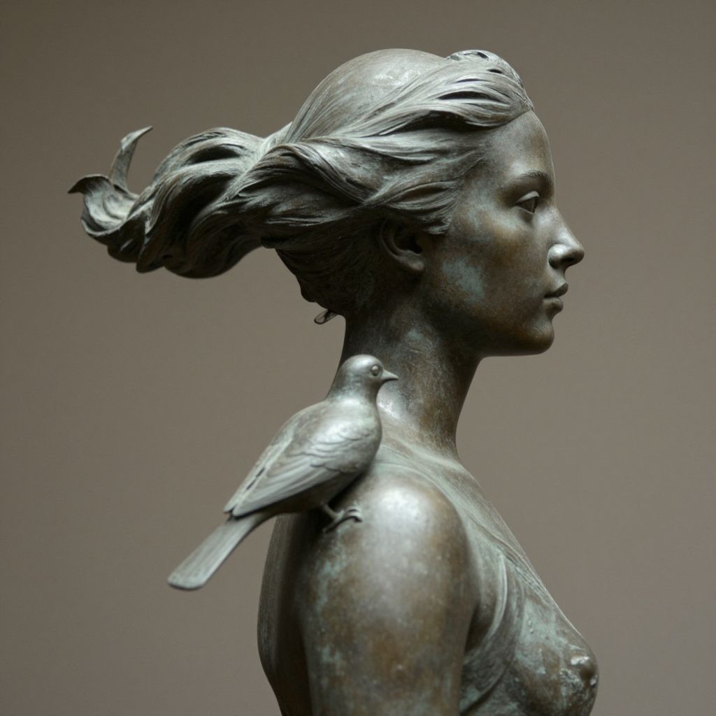 Photograph of a bronze sculpture depicting a young girl in profile with windswept hair, wearing a simple top. A small bird perches on her right shoulder. The sculpture's texture is smooth with detailed hair and feathers. The background is a plain, muted gray, highlighting the sculpture's dark bronze color and intricate details. The girl's expression is serene, and the bird's wings are delicately carved, adding a sense of movement. The overall style is realistic yet slightly abstract, focusing on natural forms and emotional expression.
