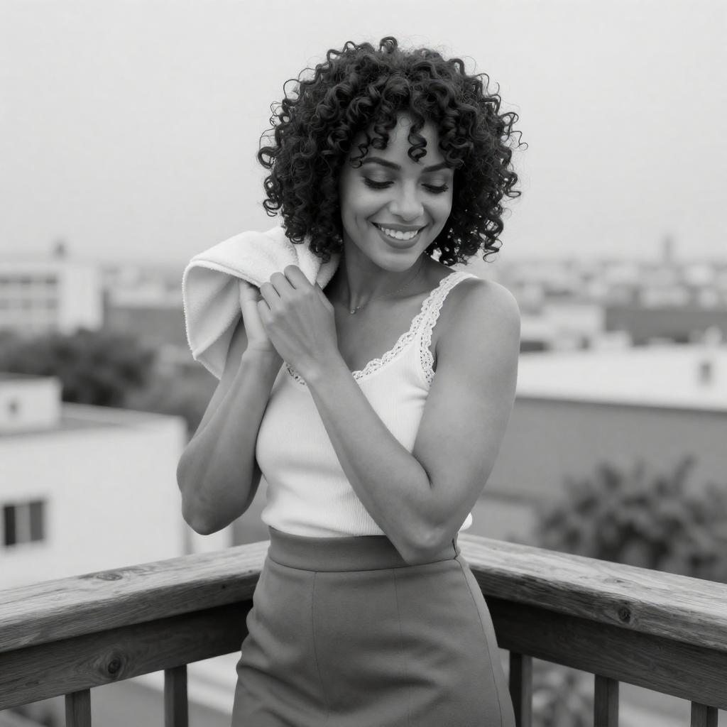 Black-and-white photograph of a smiling woman with curled hair, wearing a lace-trimmed, sleeveless top and high-waisted skirt, standing on a wooden balcony. She holds a towel over her left shoulder with both hands, looking down. Cityscape in the background.