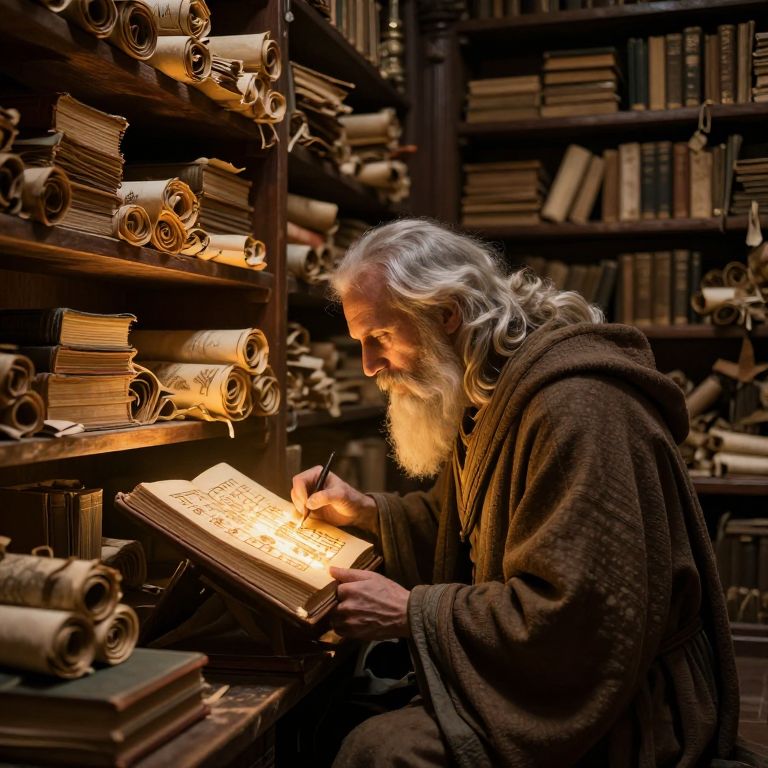 Photograph of an elderly man with long white hair and a full white beard, wearing a brown, textured robe, sitting in a dimly lit, cluttered library. He is illuminated by a warm, glowing book he holds open with both hands, writing with a quill. The background features tall, dark wooden shelves filled with rolled parchments and bound books. The image has a rich, warm color palette with deep browns and golden light, evoking a medieval or Renaissance setting. The man's focused expression and the detailed textures of his robe and the books create a sense of historical scholarship and intellectual pursuit.