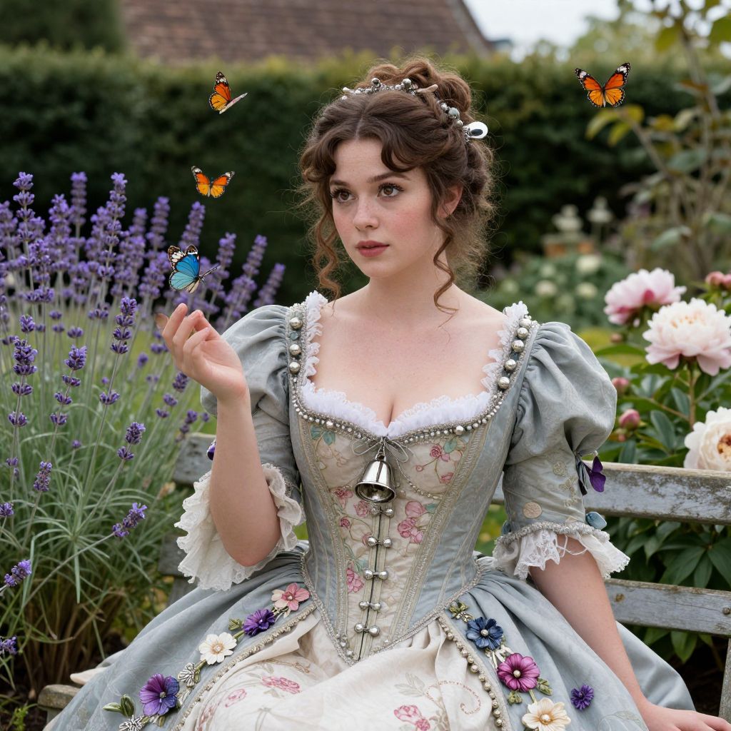 Realistic portrait of a woman in a meticulously detailed Victorian fairy costume, sitting on a garden bench with butterflies fluttering around her, her face is beautifully defined—fair skin, soft freckles on cheeks, large brown eyes with a knowing look—wearing a full corseted gown adorned with tiny silver bells and floral appliqués, the setting is an old English cottage garden with blooming lavender and peonies, capturing the fantasy and elegance of the era.. The woman has big tits and cute face