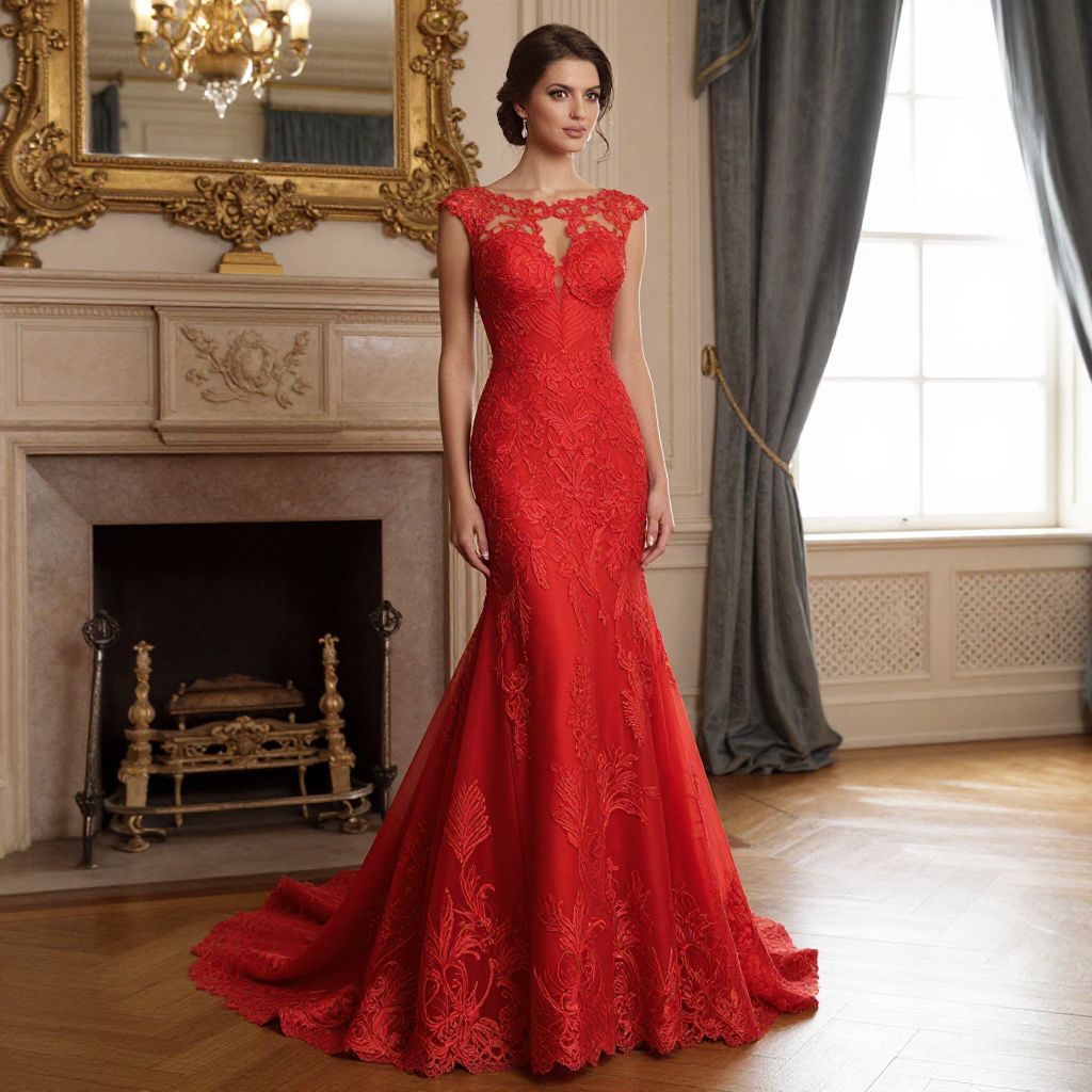 Photograph of a slender, fair-skinned woman with dark hair in an elegant updo, standing in an opulent room. She wears a form-fitting, red lace gown with a deep V-neck and cap sleeves, featuring intricate floral patterns. The gown flares into a subtle train. She stands in front of a marble fireplace with an ornate gold mirror above it, reflecting a chandelier. The room has wooden parquet flooring, a large window with blue curtains, and white wainscoting. The lighting is soft, highlighting the rich texture and color of the dress.