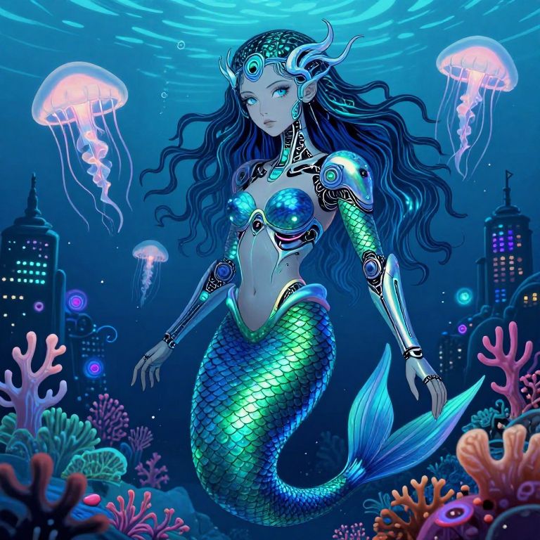 An enchanting digital art portrait depicts a cyborg mermaid with scales that shimmer in mesmerizing iridescent hues of blue and green. The fusion of intricate linework and bioluminescent worlds creates a striking contrast between her organic features and sleek metallic armor, capturing her mysterious gaze from an 'eye-level' perspective as she emerges from the depths of a neon-lit underwater cityscape. Glowing jellyfish and technicolor coral illuminate this surreal atmosphere, evoking both wonder and intrigue for the enigmatic creature suspended in the liminal space between nature and machine.