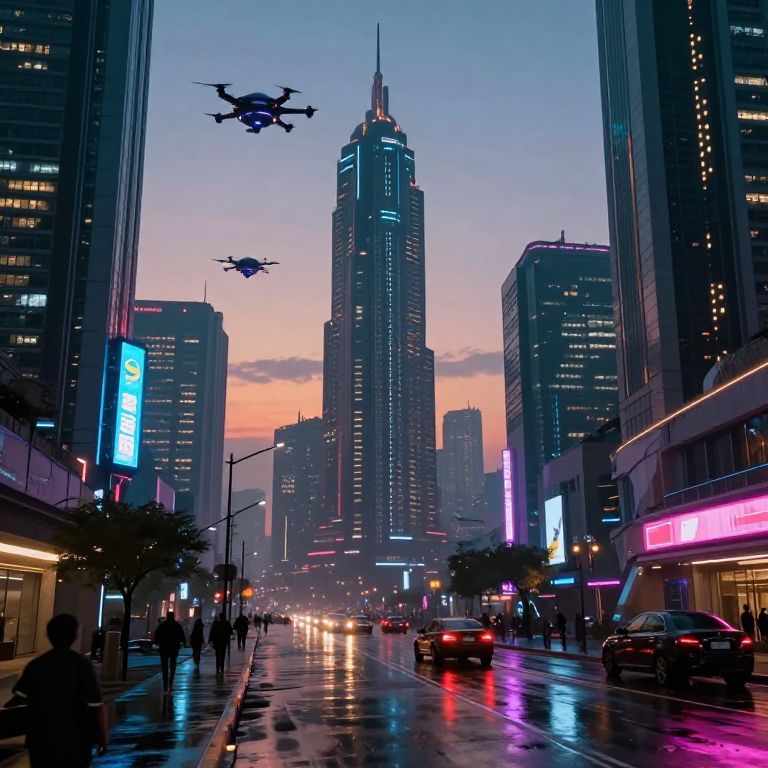 Photograph of a sunset over a city, featuring two ornate, clock-tower structures with gears, a drone flying, and a sunlit,