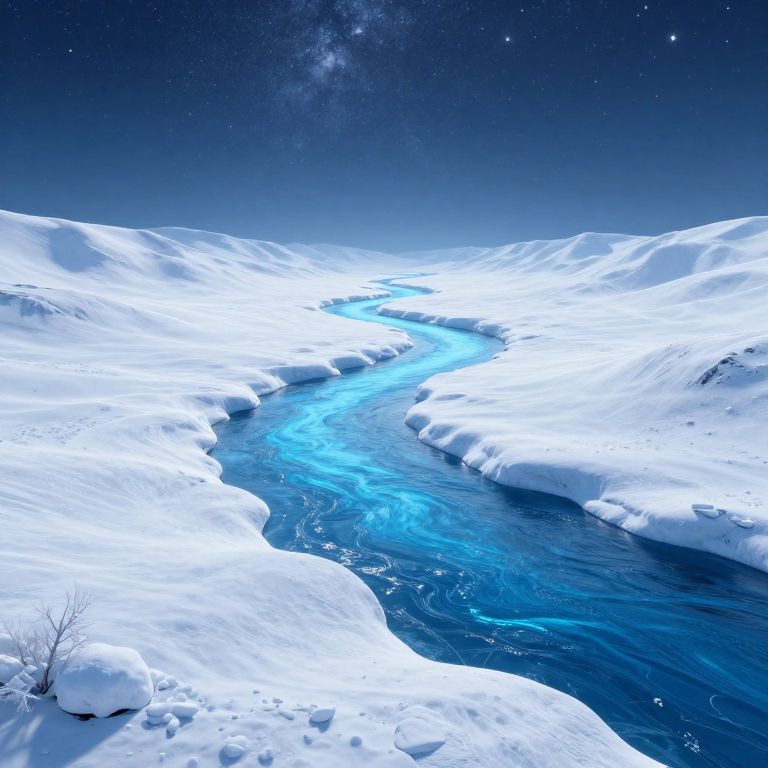 A serene 3D-rendered landscape features a vibrant blue river meandering through a snow-covered terrain under a starry night sky, evoking a dreamlike, otherworldly atmosphere with its high-definition realism and ethereal lighting effects.