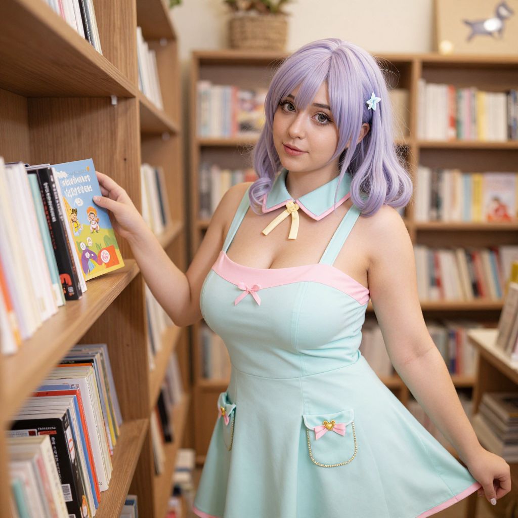 A busty woman in a whimsical kawaii style, wearing a pastel skater dress with a mint green collar and decorative pockets, is joyfully browsing through a quaint bookshop. Her soft makeup and pastel-colored hair complement the charming atmosphere as she examines a colorful book, surrounded by shelves filled with literary treasures. Sexy. Pretty face and beаutiful eyes. Big breasts