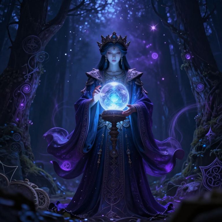 Savras, mythical ancient oracle with glowing crystal ball, standing in a dark enchanted forest under a starry sky, intricate robes flowing, magical symbols swirling around, ethereal atmosphere, rich blue and purple tones, high detail fantasy art style.