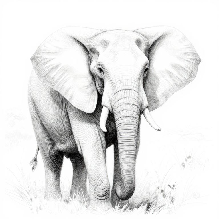 Line drawing elephant created with delicate, overlapping lines to depict texture and depth, emphasizing the large ears and expressive eyes, set in an abstract savannah environment with sparse, sparse brush strokes for background elements.