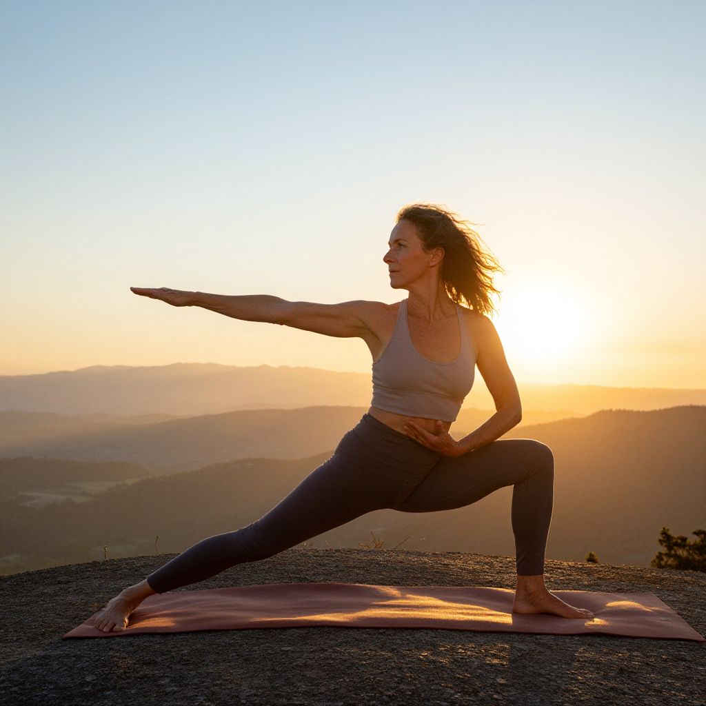Hairy mature woman practicing yoga at sunrise on a mountain top, windswept hair and natural wrinkles highlighted by warm golden light, dressed in minimalist athletic wear, stunning panoramic background, vibrant and uplifting scene