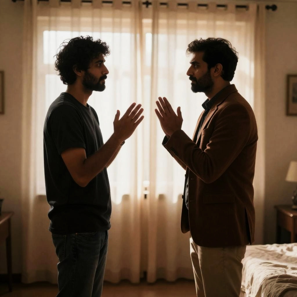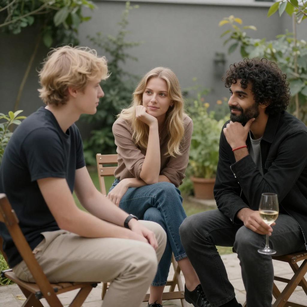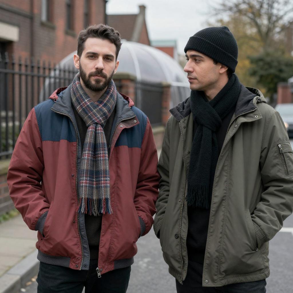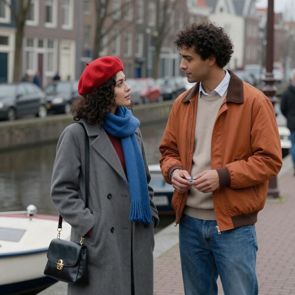 Photograph of two men standing on a canal bridge. The man on the left has dark curly hair, a green jacket, and a beard. The man on the right has light brown hair, glasses, a gray jacket, and is holding a yellow object. Background includes trees, buildings, and a canal with boats. Both men are smiling and looking at each other.