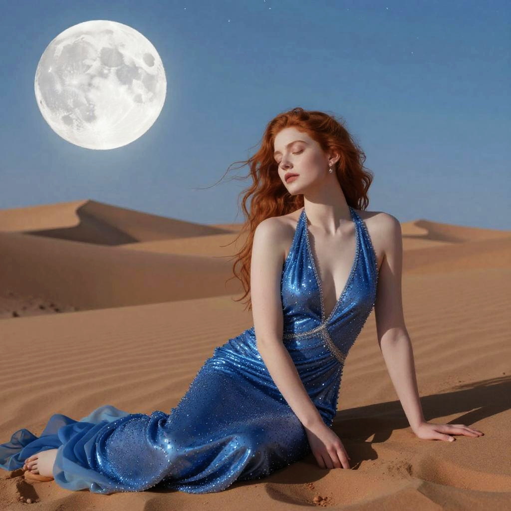 A digital art image of a red-haired woman with fair skin sitting in a desert under a bright, full moon. She wears a sparkling blue evening gown with a deep V-neck and flowing skirt, sitting on reddish-orange sand dunes. Her eyes are closed, and her hair is slightly wind-blown. The night sky is starry, adding to the magical atmosphere.