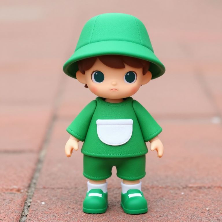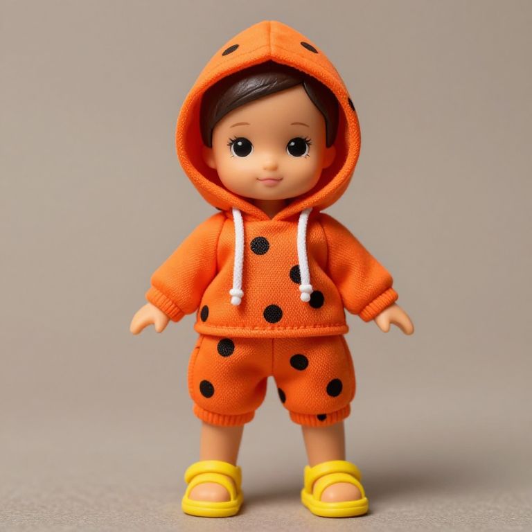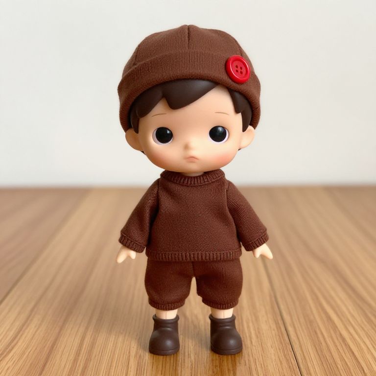 A doll with a brown outfit and a brown sweater is standing on a wooden floor. The doll has a brown head with a red button on it.