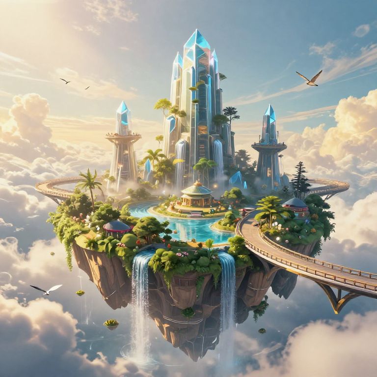 A surreal 3D-rendered fantasy landscape depicts a futuristic cityscape suspended in the sky, inverted and tethered by shimmering cables, as aerial gardeners cultivate verdant flora that defies gravity, creating a mesmerizing visual effect against a backdrop of ethereal clouds and lush mountainous terrain.