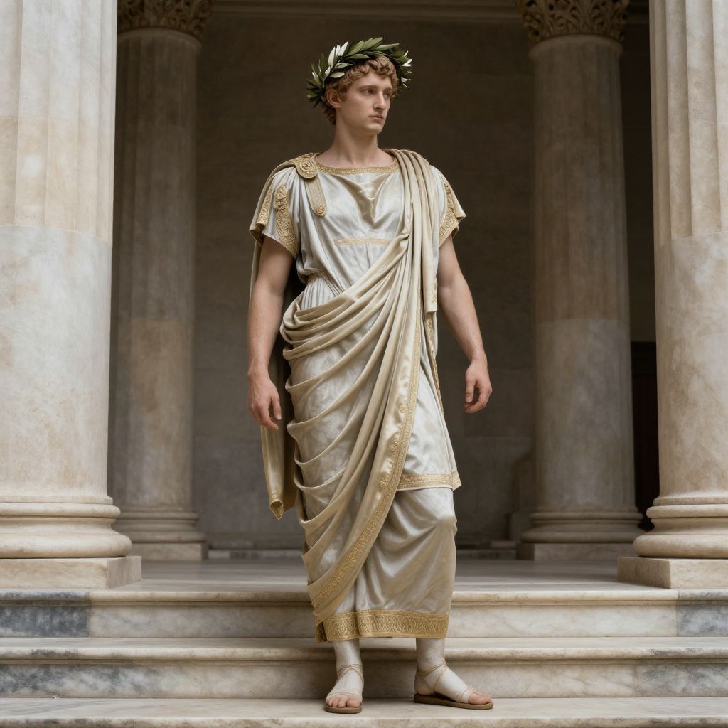 Elagabalus as a youthful emperor, draped in luxurious silk robes, standing confidently on marble steps of Roman temple, adorned with laurel wreath, soft ambient light highlighting features, high detail classical realism painting