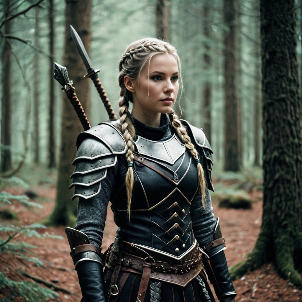 Nordic Braid hairstyle on female model, wearing embroidered woolen coat, in historic Nordic village street, captured in fashion editorial style with soft golden hour light.