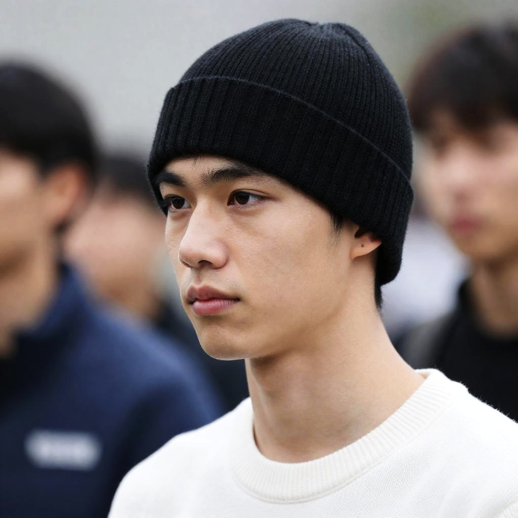 Photograph of a young man with short, messy blonde hair, wearing a white t-shirt, standing beside a car. Background shows a blurred group of people, including a person in a white hat and several others with varied expressions.