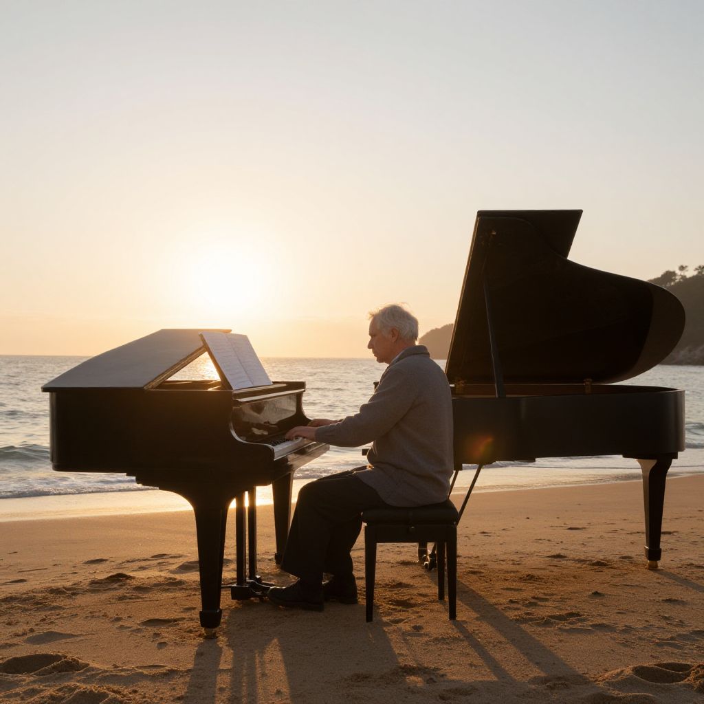 Photograph of an elderly white man with short gray hair, wearing a gray sweater and black pants, playing a grand piano on a sandy beach at sunset. The piano is black, and its lid is open, revealing sheet music on the stand. The sun is low on the horizon, casting a golden glow and long shadows across the sand. The ocean is visible in the background, with gentle waves and a small rocky outcrop to the right. The man is seated on a simple black chair, focused on the piano keys.
