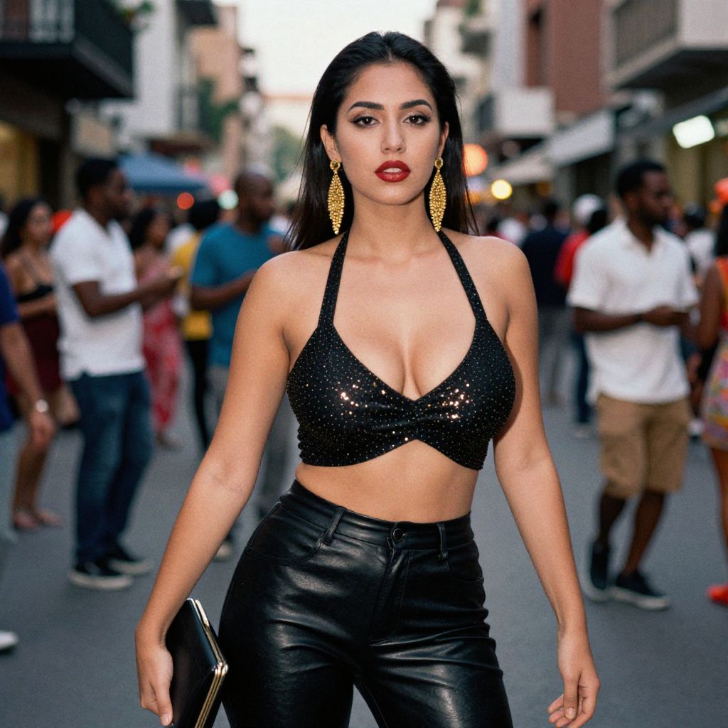 Photograph of a confident Latina woman with long black hair, wearing a sparkly black halter top and leather pants, standing in a bustling urban street