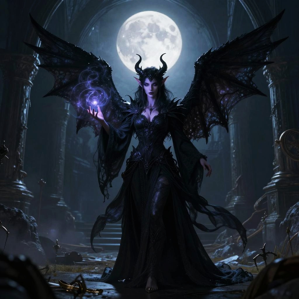 Dark female demons of hell, with glowing red skin, sharp claws, and smoky wings, standing amidst charred landscapes and molten magma, detailed digital art