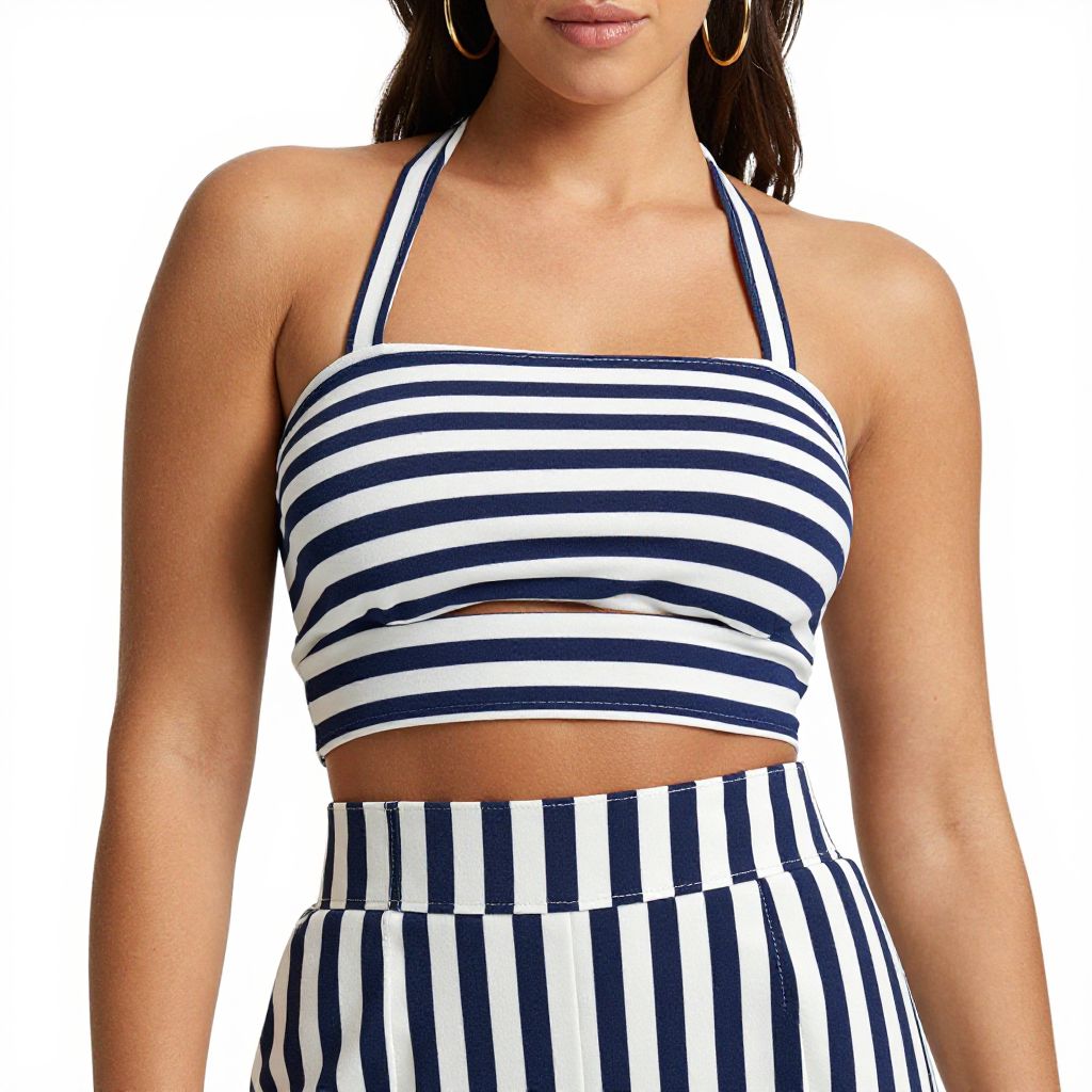 Woman, contemporary summer style, striped halterneck crop top with cut-out midriff, coordinating high-waisted shorts, vertical blue and white stripes, gold hoop earrings, white background.. Sexy. Pretty face and beаutiful eyes. Big breasts.