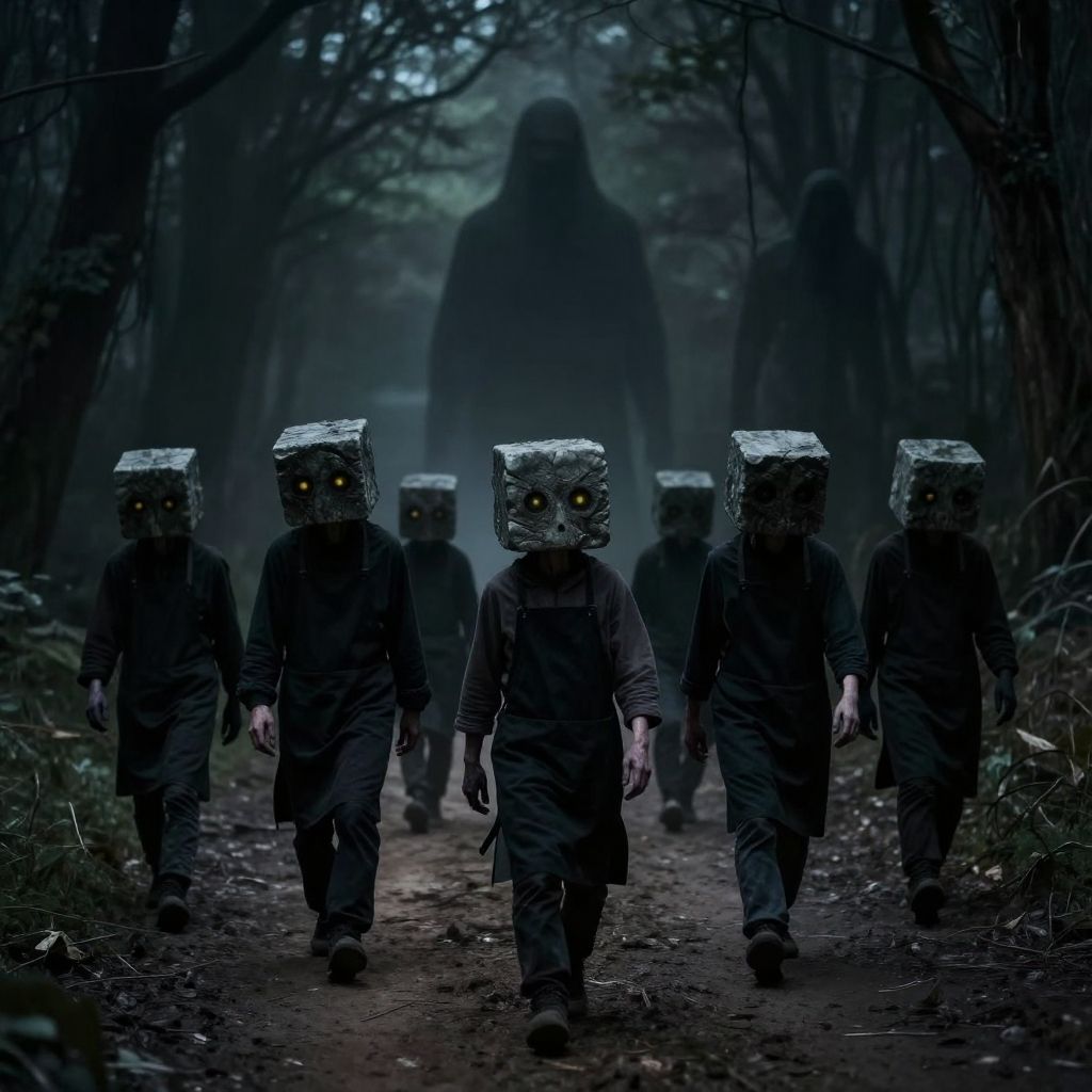 Photograph-style digital artwork depicting a dark, eerie forest path at dusk. Seven figures walk towards the camera, each wearing black, hooded clothes and square, metallic masks with glowing yellow eyes. The figures are centered in the image, with a larger, shadowy figure looming in the misty background. The forest is dense with tall, dark trees, and the ground is covered in dirt and fallen leaves. The overall color palette is dark and moody, with deep blues and blacks dominating the scene, creating a sense of foreboding and mystery.