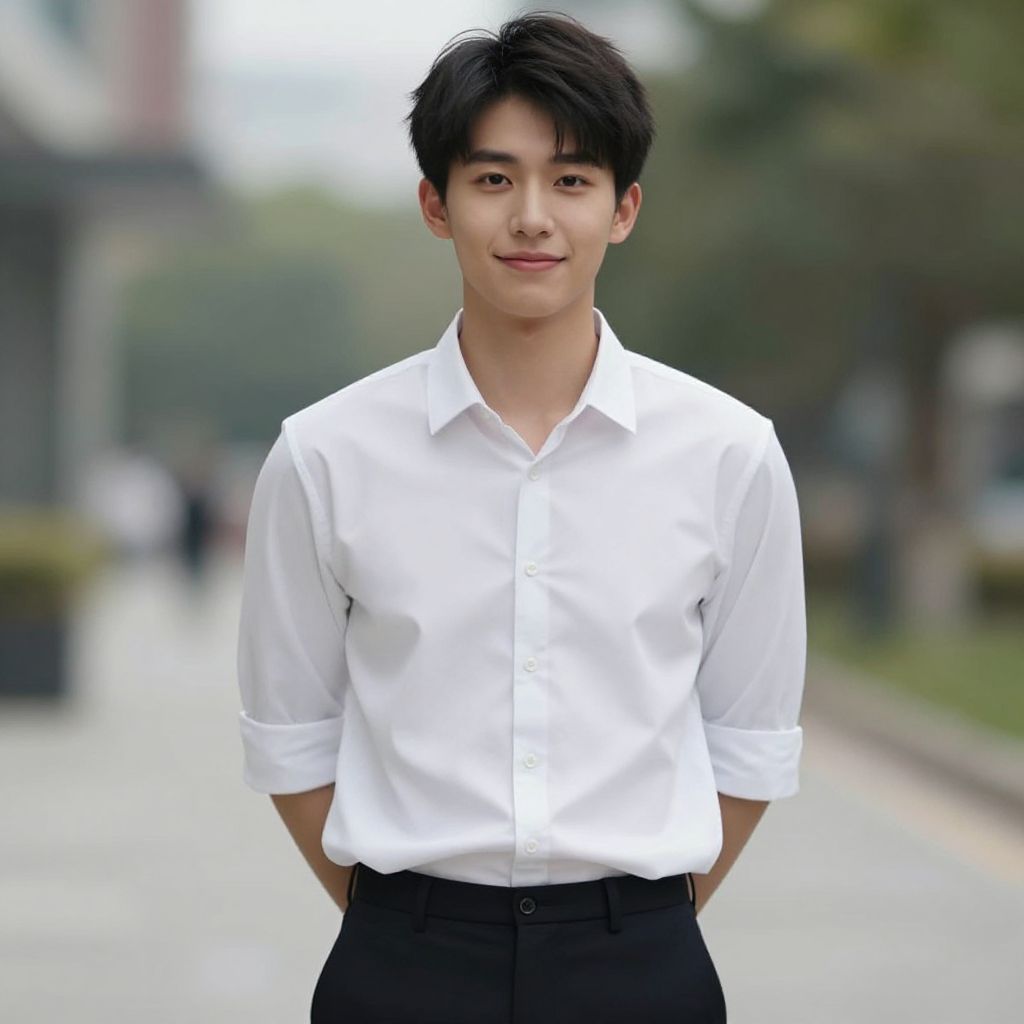 Photograph of a young Asian man standing outdoors on a blurred, urban street. He has short, black, slightly messy hair and a light skin tone. He is wearing a crisp, white, long-sleeve button-up shirt with the sleeves rolled up to the elbows and black pants. His hands are behind his back. The background is out of focus, featuring a sidewalk, greenery, and indistinct buildings. The man's expression is neutral, with a slight, closed-mouth smile. The overall style is clean and professional, with an emphasis on simplicity and contrast.