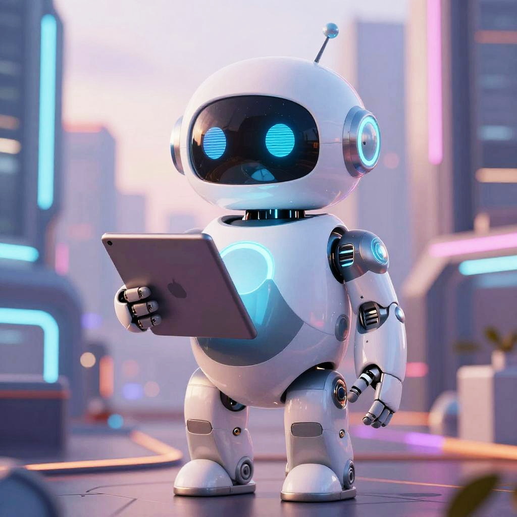 Chubby boy AI robot with round features, smooth metallic skin with soft pastel color palette, holding a tablet, standing in a neon sci-fi city at dusk, high detail