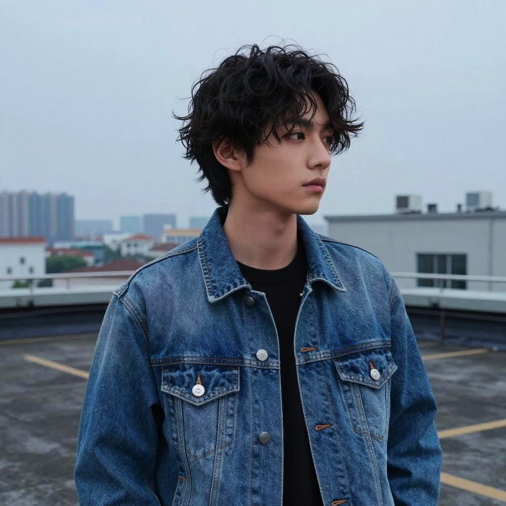 Young Man with Wavy Blowout Hairstyle in Denim Jacket