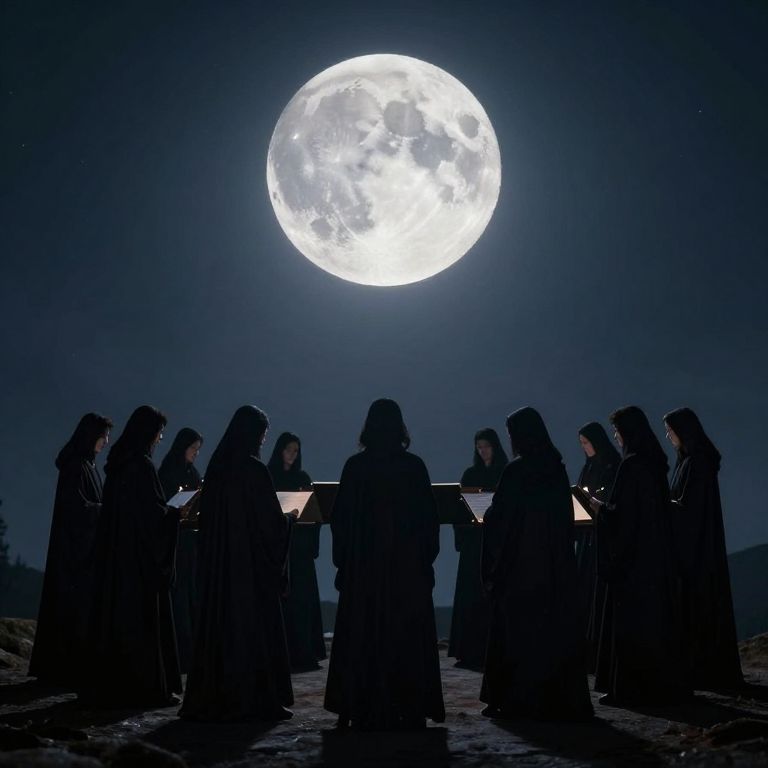 Under the watchful gaze of a luminous moon, a circle of cloaked figures stands in solemn reverence, their silhouettes forming a celestial orchestra that whispers ancient secrets and echoes the timeless rhythm of existence.