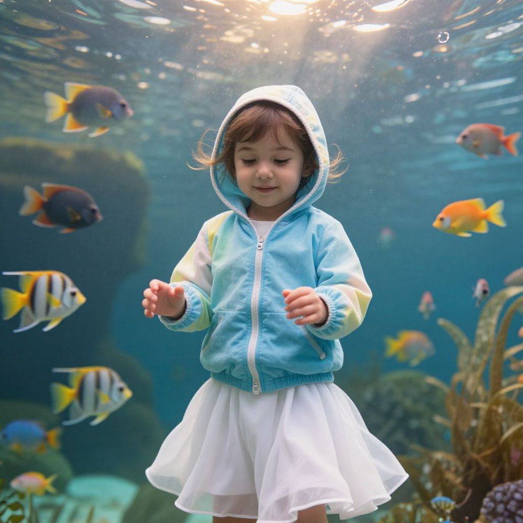 A young child, approximately 5 years old, is wearing a colorful blue and white outfit with a soft hooded jacket and a flowing white skirt. The child is standing upright, smiling gently, with their hands slightly raised as if reaching out. The background is a vibrant underwater scene filled with various fish swimming in the water, including colorful tropical fish, angelfish, and small schooling fish, creating a lively and playful atmosphere. The lighting is soft and natural, with a gentle golden hue filtering through the water, giving the image a dreamy and joyful feel.