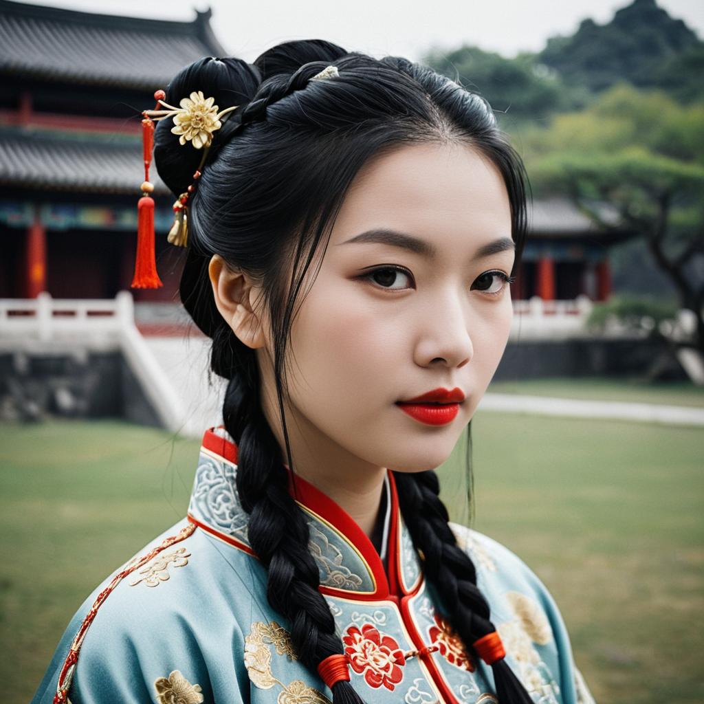 Portrait of an Asian woman wearing a pink traditional Chinese-inspired dress with intricate embroidery and puffy Juliet sleeves. She has black braided hair styled in buns, adorned with a gold crown and elegant earrings, looking directly at the camera with a confident expression.