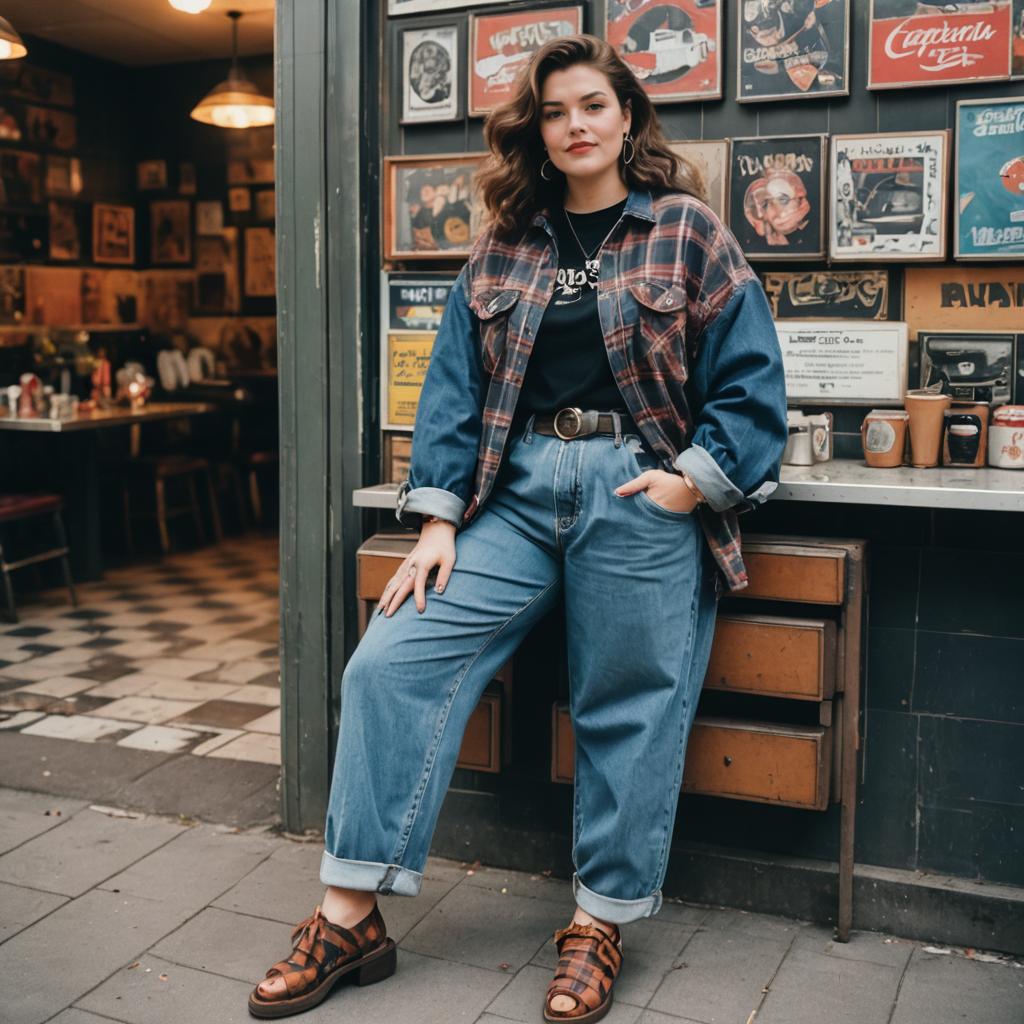 Photo of a Curvy woman, Side Swept, 90s outfit, baggy jeans in Bistre, oversized flannel shirt in Flannel, graphic t-shirt, denim jacket, leather sandals, grunge style, plaid patterns, muted colors, casual, vintage, retro, 1990s fashion, Retro diner, high contrast colors