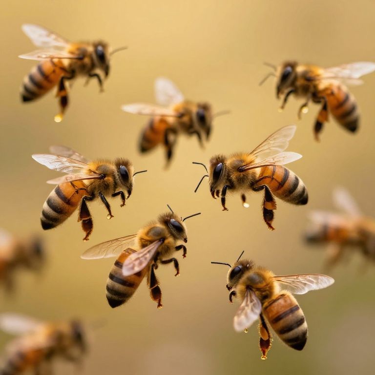Photograph of seven honeybees in mid-flight against a soft, golden-yellow blurred background. The bees have black and yellow striped abdomens, translucent wings, and small, dark bodies with fuzzy thoraxes. Each bee's wings are slightly blurred, indicating motion. One bee in the foreground has a visible drop of nectar on its right hind leg. The lighting highlights the bees' wings and striped patterns, creating a warm, natural ambiance. The image captures the bees in a dynamic, almost circular formation, emphasizing their coordinated movement.