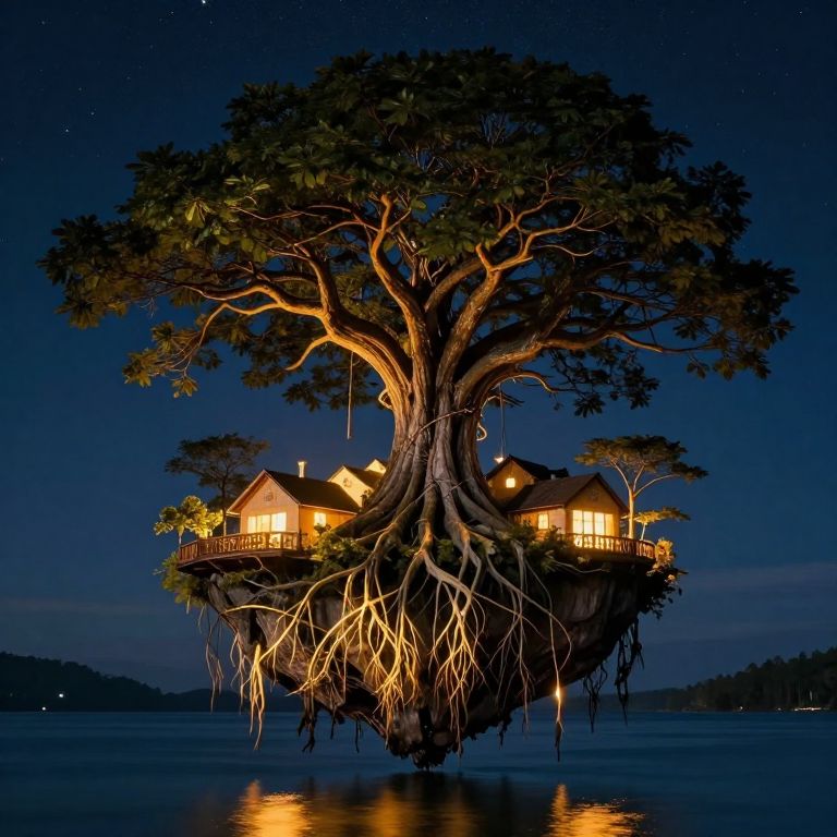 Towering tree branches spread wide against a starry night sky, its massive trunk rooted firmly atop a floating island where warm, glowing houses nestle beneath, while its intricate roots dangle like golden threads, reflecting brightly on the tranquil waters below.