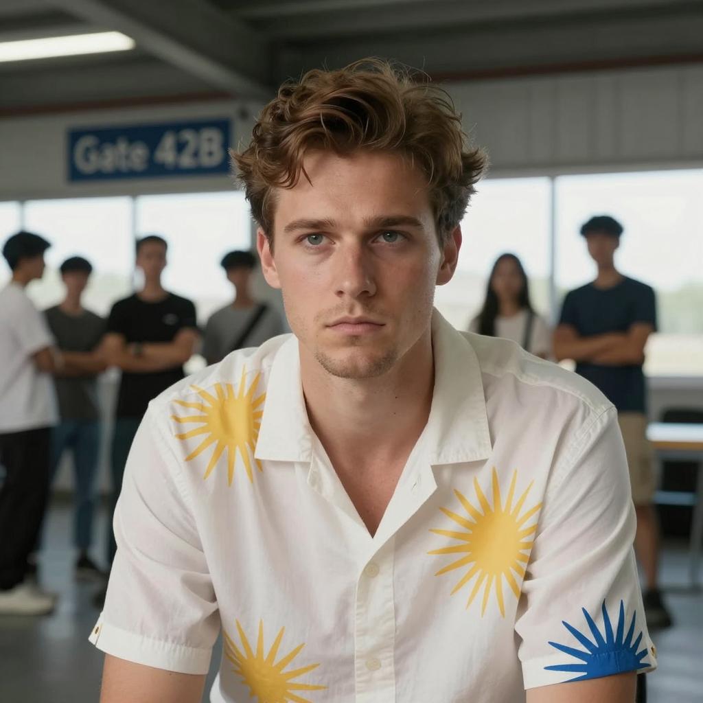 A photograph of a man with light skin and brown hair, wearing a white shirt with yellow and blue sunburst patterns, sitting indoors. He has a serious expression. Behind him, a group of people stands near a gate sign reading "Gate 42B." The background includes large windows and industrial ceiling elements.