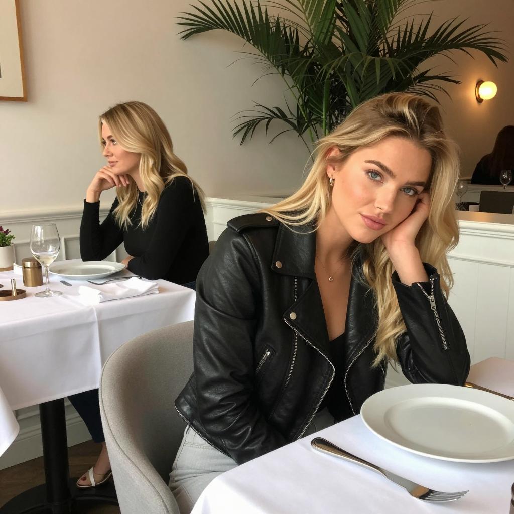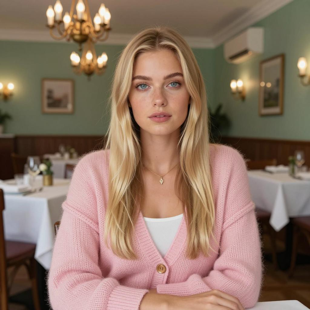 Blonde woman with shoulder-length hair, wearing a red and white striped long-sleeve shirt, holding a glass of red wine in front of her face, standing in a dimly lit, ornately decorated restaurant. Wood-paneled wall, large mirror, chandeliers, floral-patterned trim. Background includes tables, chairs, and hanging lights. Woman's right hand holds a green shoulder bag.