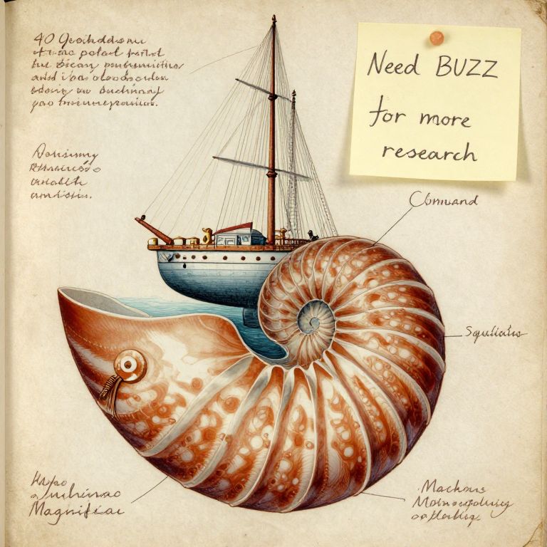 A davinci diagram in the style of the voynich manuscripts, depicting a chambered nautilus being inspiration for an underwater ship, inspired by 40, 000 leagues under the sea, hand written annotations, aged parchment, Machina Magnifica, Note affixed that says \"Need BUZZ for more research\", 4k quality