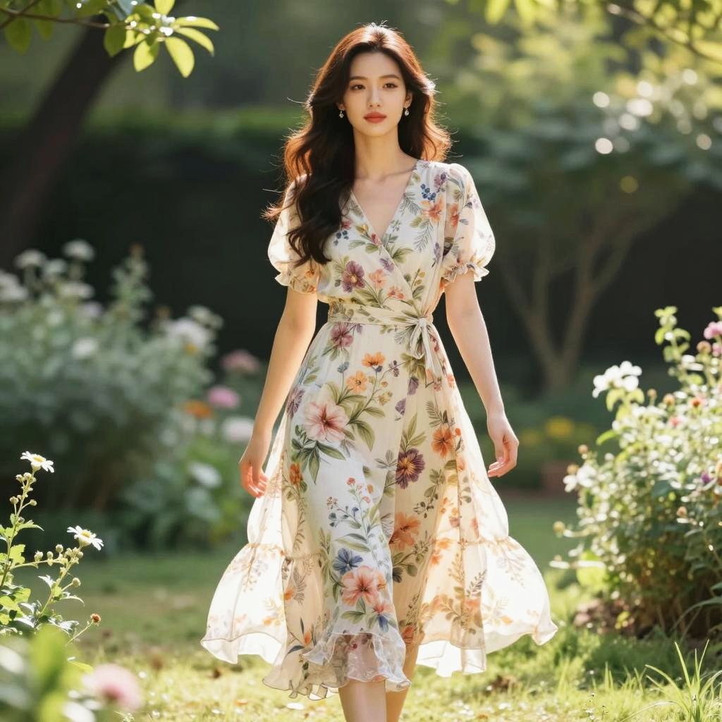 This stunning illustration features a stylish woman with a confident pose, set against a soft pink background. Her elegant floral dress and flowing hair create a harmonious blend of modern fashion and artistic flair.