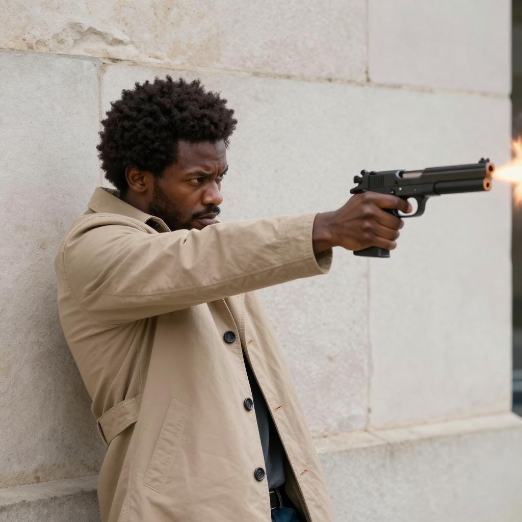 A young Black man with short curly hair, medium build, and a mustache, wearing a gray sweater. He holds a black handgun in his right hand, looking surprised with wide eyes and slightly parted lips. Neutral beige background. He is positioned slightly to the right, facing left.