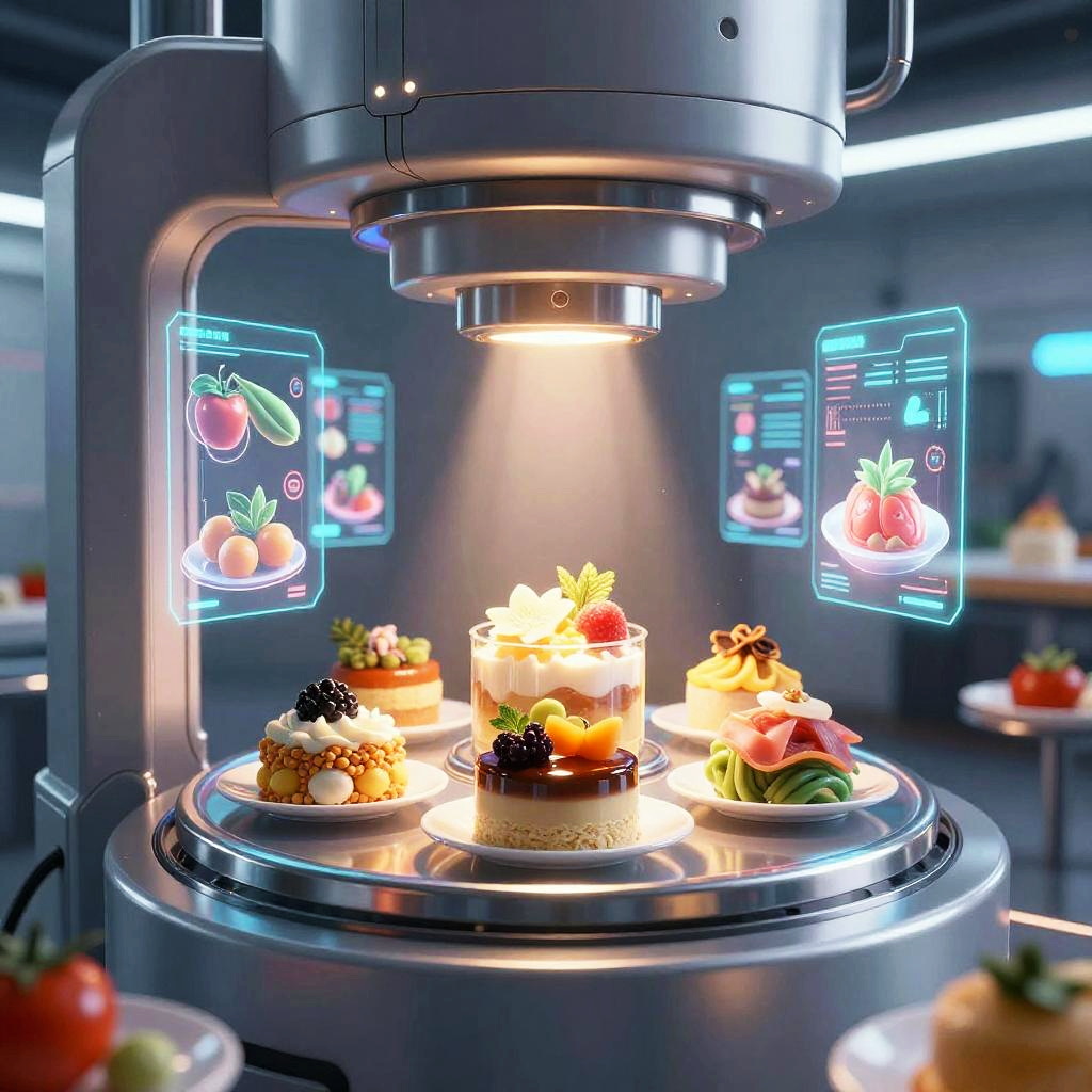 AI food generator visualized as a futuristic machine assembling elegant multi-layered dishes, surrounded by floating holograms of ingredients, vibrant glowing lights, ultra-high detail, sleek metallic surfaces, digital culinary innovation theme, cyber aesthetic