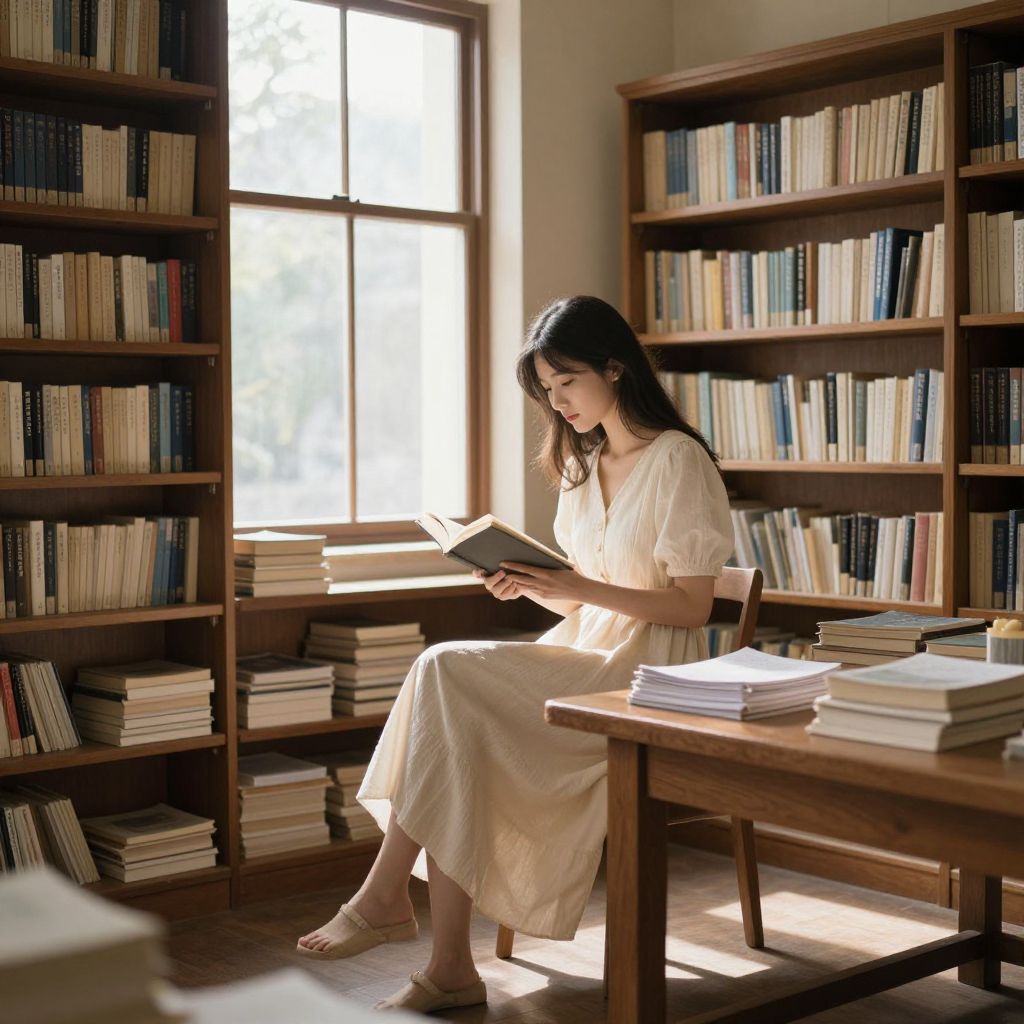 Sunlit library scene featuring a young woman in a flowing cream dress sitting on a wooden table, engrossed in reading an open book, surrounded by towering shelves filled with neatly arranged books and stacks of papers, with soft sunlight streaming through a large window casting gentle shadows and highlighting the tranquil ambiance.