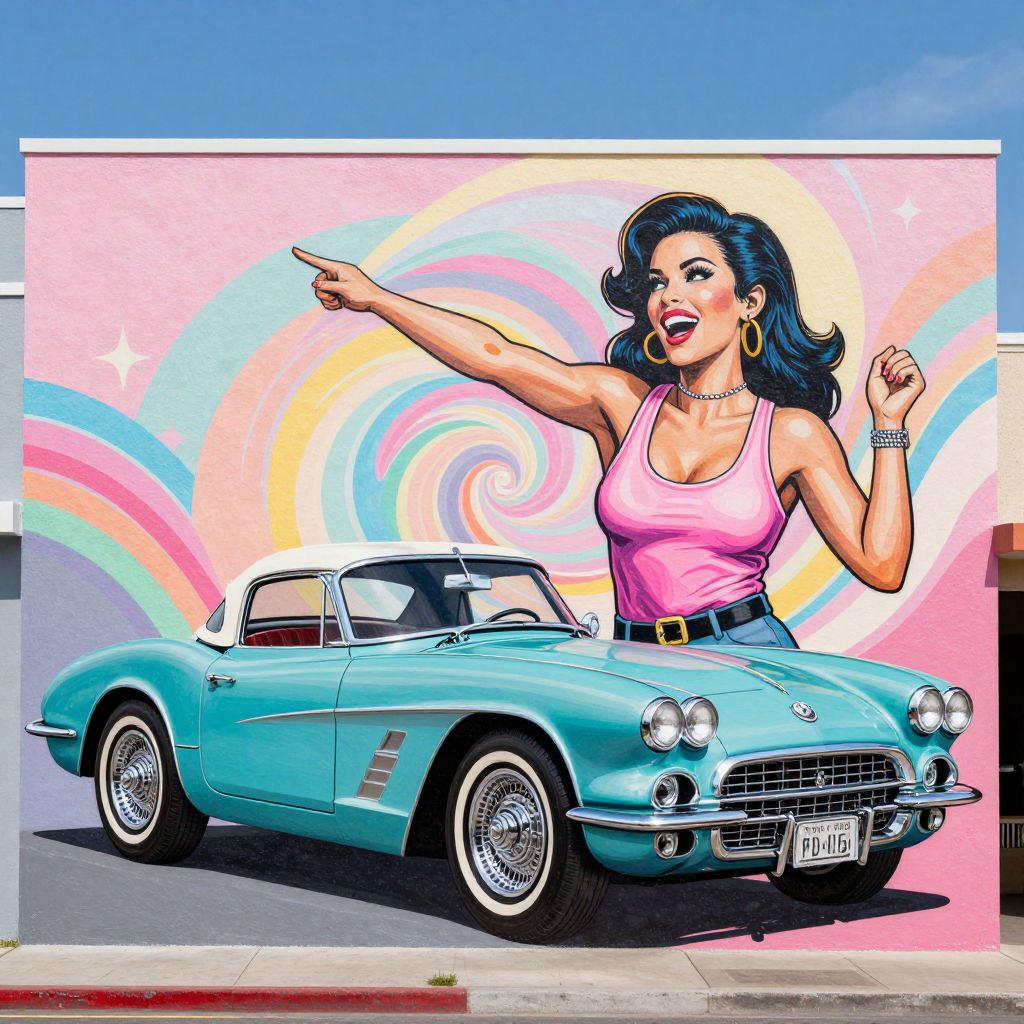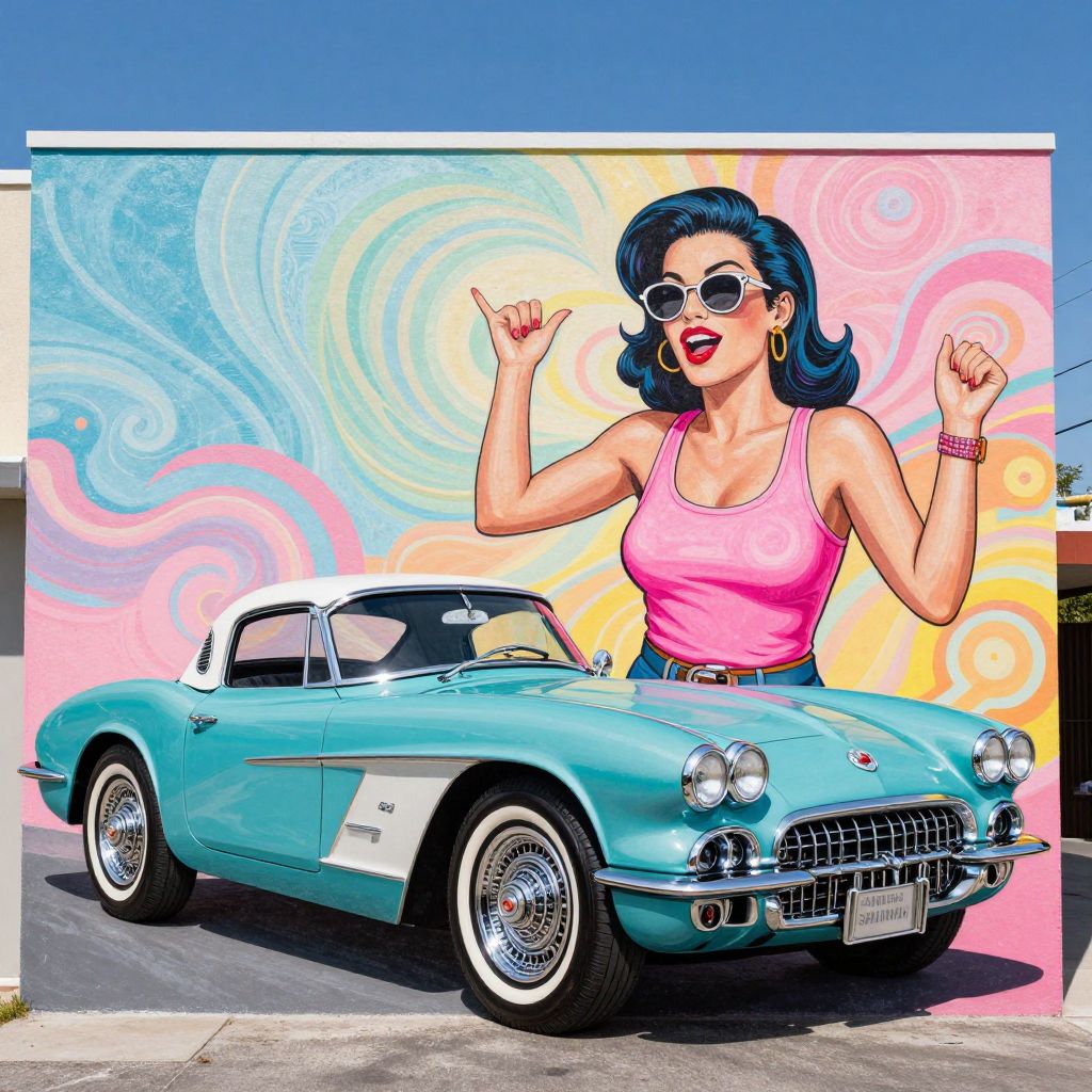 A vibrant mural by Jas Peterson, featuring a dynamic illustration of a woman in a pink tank top joyfully interacting with a classic turquoise Corvette, rendered in bold, retro-inspired colors and comic-style details against a backdrop of swirling pastel hues and a clear blue sky.