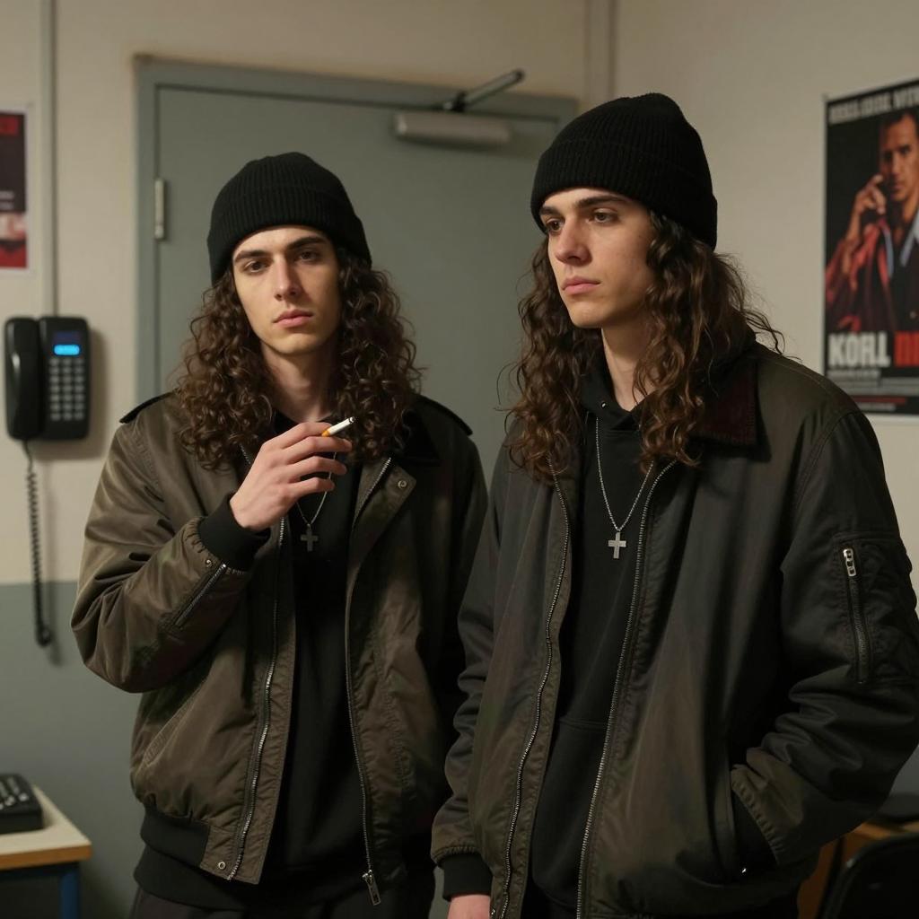 Two people with long curly hair, wearing dark jackets and beanie hats, stand in a dimly lit room. The person on the left holds a cigarette near their chest, while the person on the right looks to the side. Background includes a metal door, a phone, and a wall with posters.