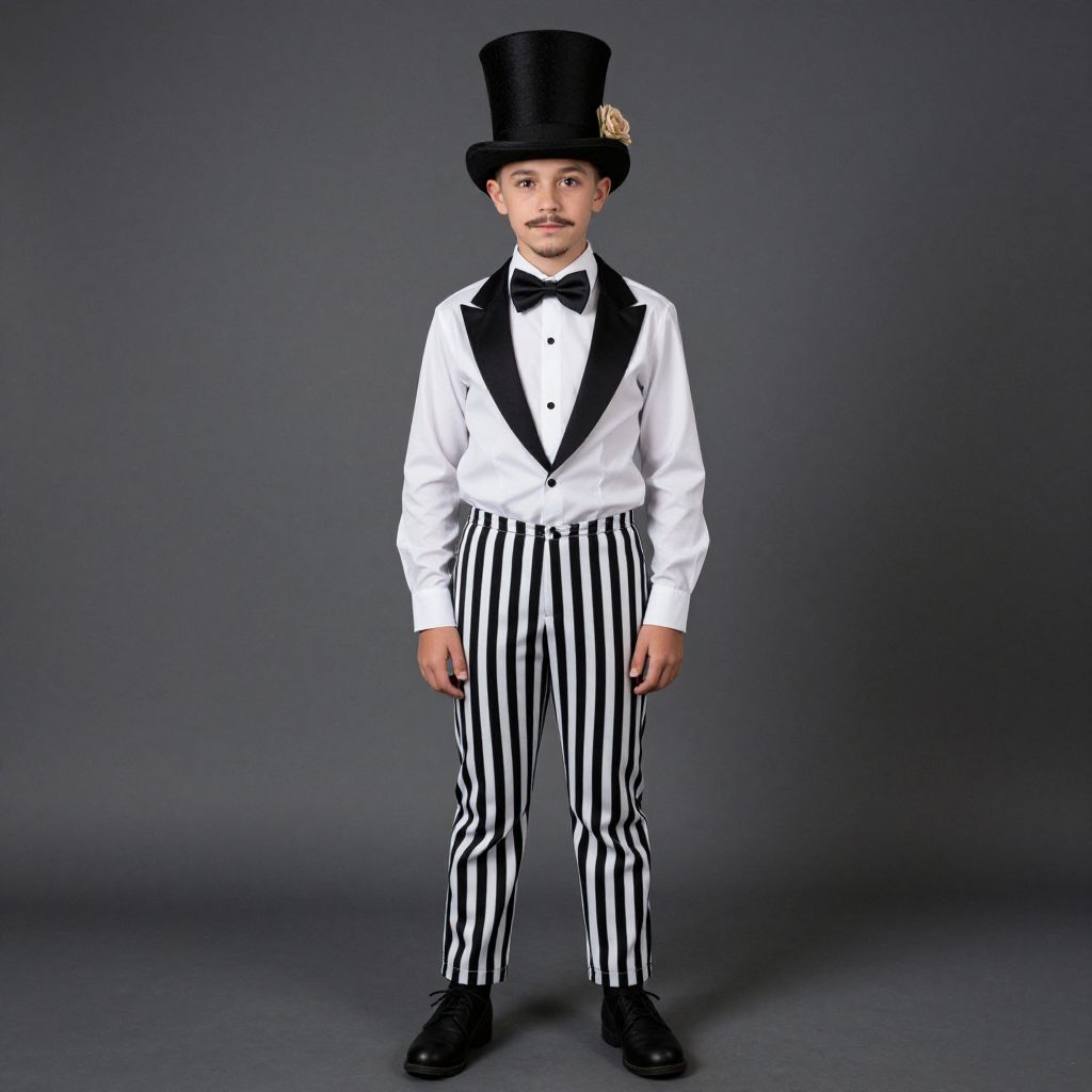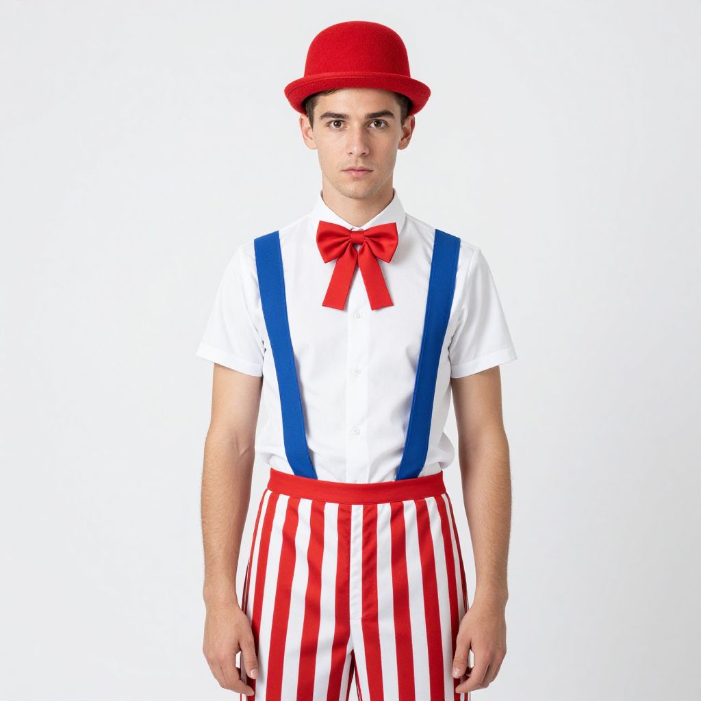Photograph of a young Caucasian man with short brown hair, wearing a bright red bowler hat, white short-sleeve shirt with a large red bow tie, blue suspenders, and red and white vertically striped pants. He stands against a plain white background, looking directly at the camera with a neutral expression. His attire resembles a clown or circus performer, with a clean, crisp, and colorful style. The overall composition is simple, focusing on the subject's outfit and expression.