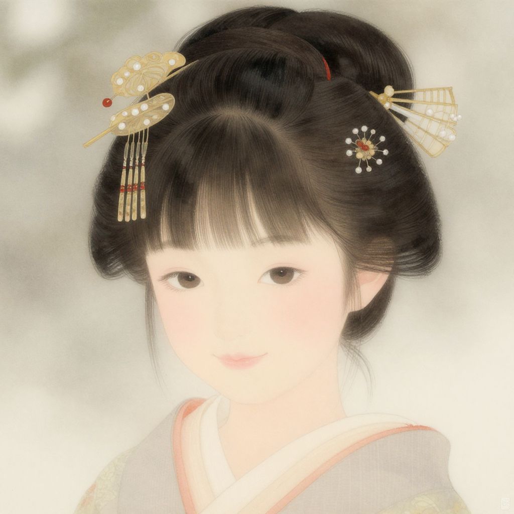 Artistic close-up of a Japanese girl with bangs, soft focus background, intricate details on her traditional hair accessories, gentle smile, muted earth tones with subtle watercolor effect, serene and timeless mood evoking classic elegance.