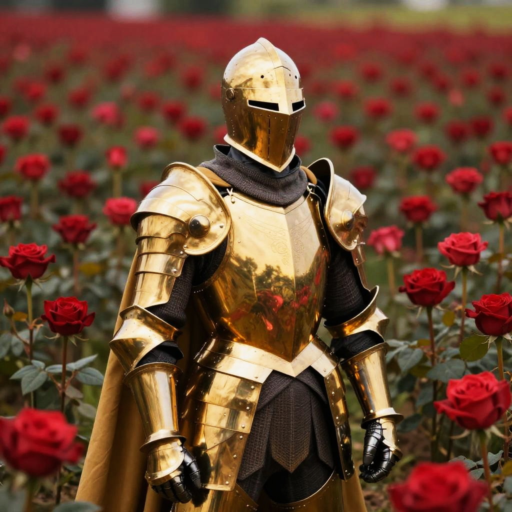 Photograph of an ornate, medieval-style knight's helmet adorned with intricate gold designs and a small horn on top. The knight's silver armor is decorated with floral patterns. A dark purple scarf is draped around the neck. Bright yellow and purple flowers with green leaves are placed on the left side of the helmet. The background is dark and moody, contrasting with the shiny armor and vibrant flowers.